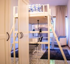 Camera singola classic con letto singolo in affitto a studenti o lavoratori, area relax con poltrona e tavolino, zona office con postazione studio, armadio con mensole e anta a specchio, libreria, tappeto. Comoda